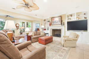The kitchen features ample cabinetry, granite countertops, a center island, double ovens, a gas stove, and a Viking refrigerator. The living room is enhanced by built-in bookshelves and a gas fireplace.