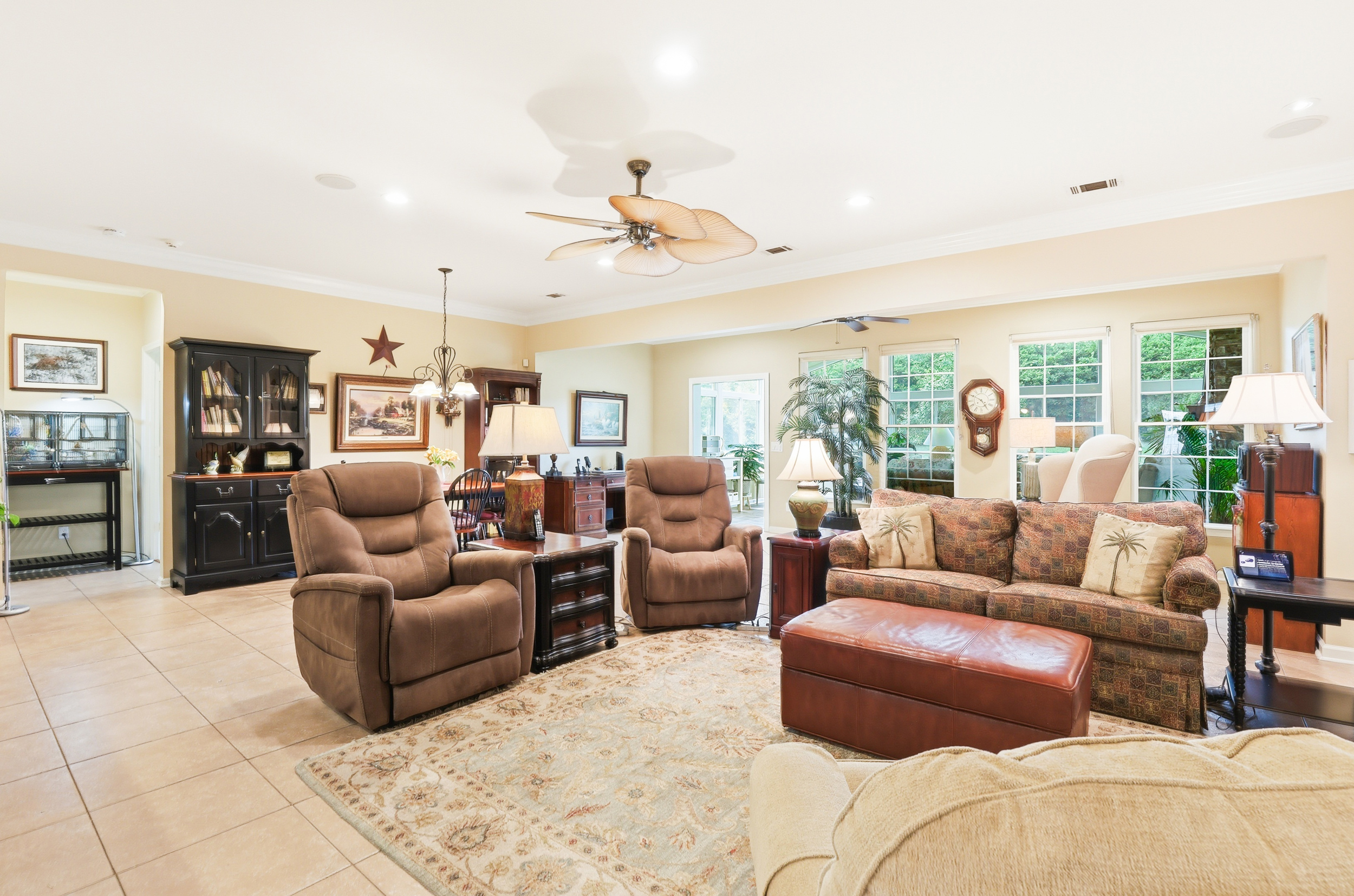 Other features include walk-up attic access with ample storage, washer and dryer conveying, laundry room with utility sink, smooth ceilings, skylight, recessed lighting, ceiling fans, crown molding, gutters, hurricane shutters on all windows and doors, surround sound, central vacuum, and a tankless water heater.