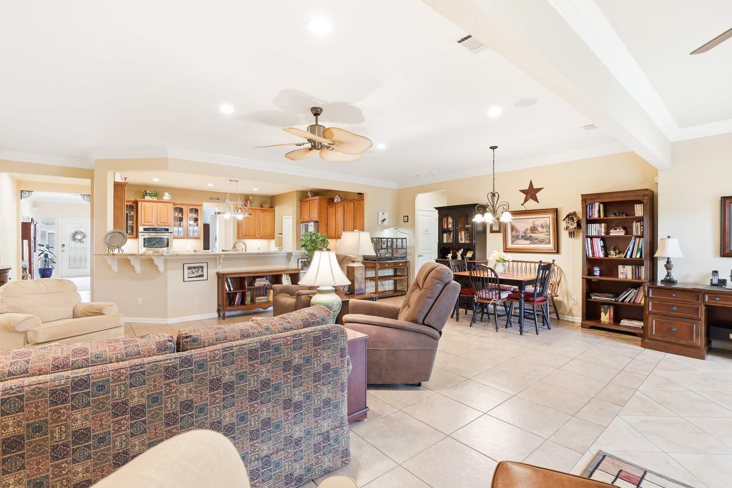 Residents enjoy Sun City’s renowned active adult lifestyle with three golf courses, multiple fitness centers, indoor and outdoor resort-style pools, pickleball, tennis, bocce, softball, woodworking, arts and crafts studios, and miles of walking and biking trails. With 100+ clubs and activities, along with restaurants, social halls, dog parks, and the new West Amenity Center, this community offers an exceptional lifestyle.