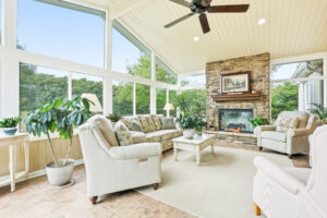 Four-Season Sunroom - Fireplace with wooded views