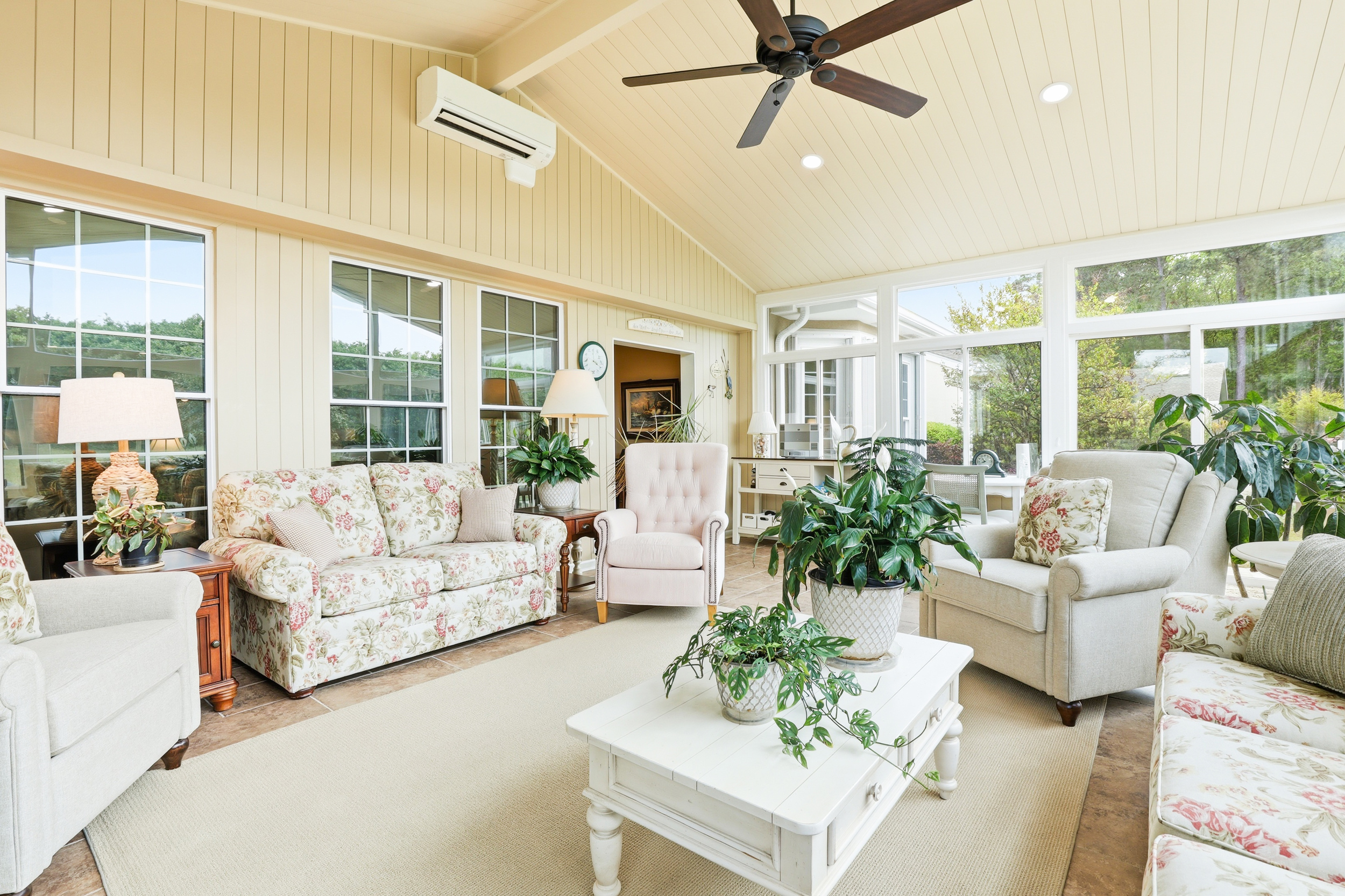 The owner’s suite includes a large walk-in closet with a custom organization system and a remodeled en suite bath. A standout feature is the expansive 16x24 four-season sunroom with a private wooded view and an additional fireplace.